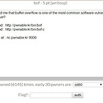 [pwnable.kr] bof Problem buffer overflow가 가장 일반적인 소프트웨어 취약점이라고 들었는데 이것이 사실이냐 묻고있다.buffer overflow에 대한 문제일 것 같았다.이번 문제에서는 ssh로 접속할 수 있는 서버가 주어지지 않았고 nc로 프로그램에 연결할 수 있게 되어있었고 소스 코드 파일과 bof 실행 파일을 다운 받을 수 있게 되어있었다.먼저 소스 코드를 확인해보았다. 12345678910111213141516171819#include #include #include void func(int key){ char overflowme[32]; printf("overflow me : "); gets(overflowme); // smash me! if(key == 0xcaf..