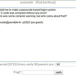[pwnable.kr]passcode Problem 로그인 시스템을 기초로 하는 passcode를 만드는 법을 들었다고 되어있고 C code로 에러없이 컴파일했지만 몇 개의 warning이 출력되었는데 봐줄 수 있느냐고 되어있었다.문제만 읽어서는 예측이 되지 않아 일단 ssh로 접속을 했다. ssh로 접속해서 확인해보니 flag 파일 하나와 passcode 실행 파일, passcode.c 소스 코드 파일이 있었다.먼저 소스코드를 확인해보았다. 12345678910111213141516171819202122232425262728293031323334353637383940414243#include #include void login(){ int passcode1; int passcode2; printf("e..